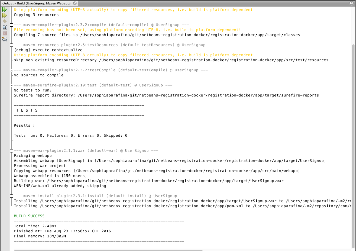 Docker will build the images for Apache Tomcat and MySQL and start the containers. It will also mount the application directory (./app/target/UserSignup) as a data volume on the host system to the Tomcat webapps directory in the web server container.
