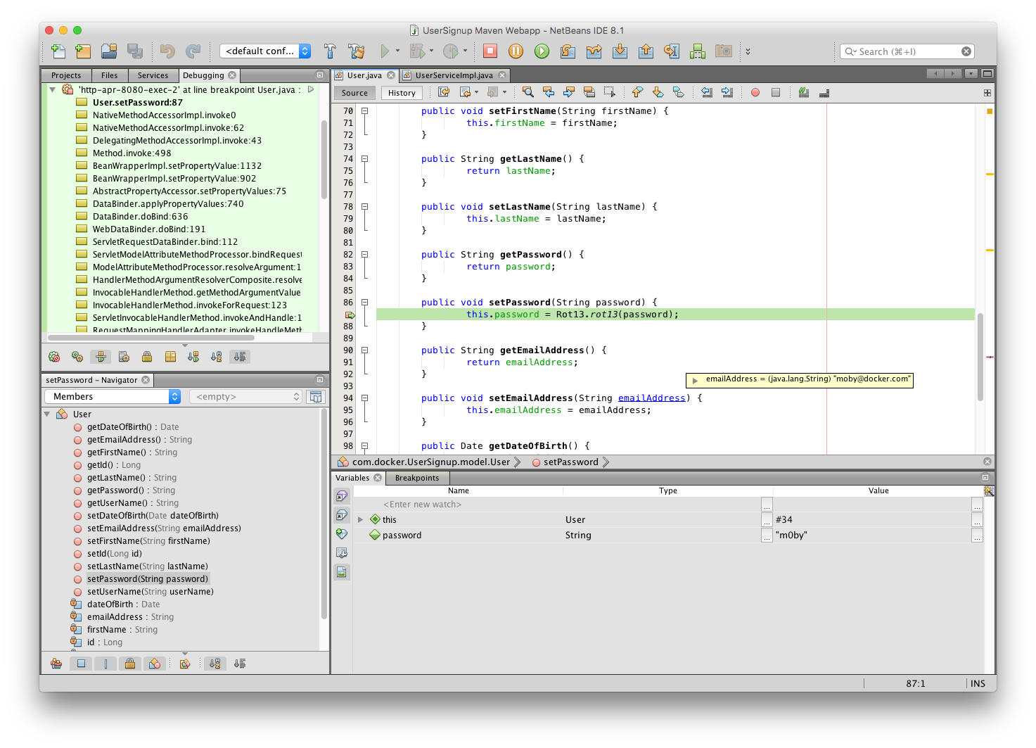 Next, set a breakpoint on the getPassword in the User class to see the value returned for password. You can also toggle off the breakpoint for setPassword. Try to log into the application. Look at the value for password in the NetBeans variables window, note that it is z0ol which is m0by using ROT13.